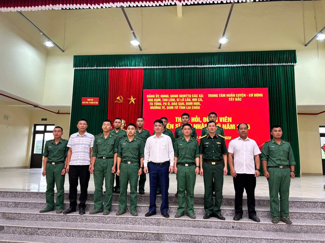 Lãnh đạo đoàn công tác của Đảng ủy - HĐND - UBND - UBMTTQVN xã Thu Lũm chụp ảnh lưu niệm cùng chiến sỹ mới nhập ngũ năm 2026 tại Trung tâm huấn luyện - cơ động Tây Bắc