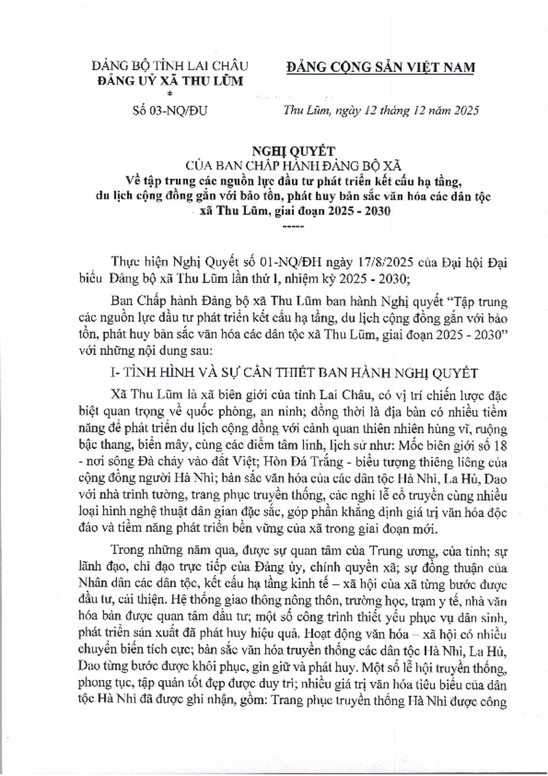 | 2 | Số 03- NQ/ĐU | NQ BCH Đảng bộ xã Về tập trung các nguồn lực đầu tư phát triển kết cấu hạ tầng, du lịch gắn với bảo tồn,phát huy bản sắc văn hóa các dân tộc xã Thu Lũm, giải đoạn 2025 - 2030 | Đảng ủy xã | ||||